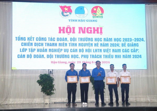 Tại Hội nghị, Ban Thường vụ Tỉnh đoàn đã tổ chức trao khen thưởng cho các tập thể và cá nhân: trao tặng Bằng khen của Ban Chấp hành Trung ương Đoàn cho 08 tập thể đã có thành tích xuất sắc trong công tác Đội và phong trào thiếu nhi năm học 2023-2024; Bằng khen của Ủy ban nhân dân tỉnh cho các 10 tập thể đã có thành tích xuất sắc công tác Đội và phong trào thiếu nhi năm học 2023-2024; Cờ thi đua của Hội đồng Đội tỉnh cho 03 tập thể đã có thành tích xuất sắc dẫn đầu trong công tác Đội và phong trào thiếu nhi năm học 2023-2024; Bằng khen của Ban Chấp hành Tỉnh đoàn cho 08 tập thể và 08 cá nhân có thành tích xuất sắc trong công tác Đoàn và phong trào thanh niên trường học, năm học 2023 - 2024; Bằng khen của Ban Chấp hành Tỉnh đoàn cho 08 tập thể và 08 cá nhân có thành tích xuất sắc trong công tác Đội và phong trào thiếu nhi, năm học 2023 - 2024; Giấy chứng nhận danh hiệu “Sinh viên 5 tốt”, “Học sinh 3 rèn luyện” và “Học sinh 3 tốt” cấp tỉnh năm học 2023-2024 cho 31 cá nhân là học sinh, sinh viên trên địa bàn tỉnh Hậu Giang.