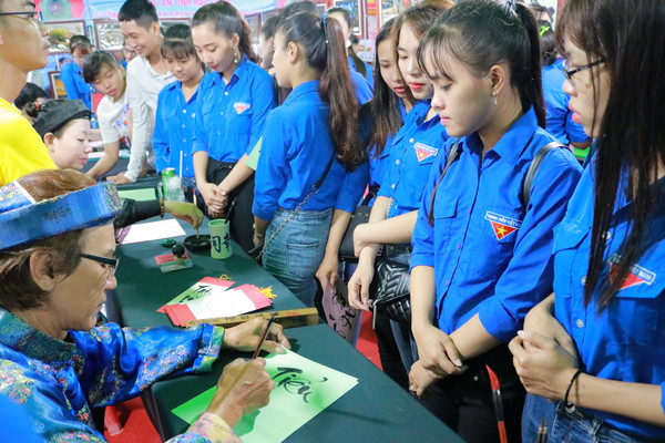 Đoàn viên thanh niên tham quan khu triển lãm ảnh nghệ thuật và viết chữ thư pháp