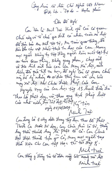 Ông Thích Minh Tuệ viết đơn đề nghị mọi người không tự ý đưa hình ảnh của ông lên mạng xã hội.