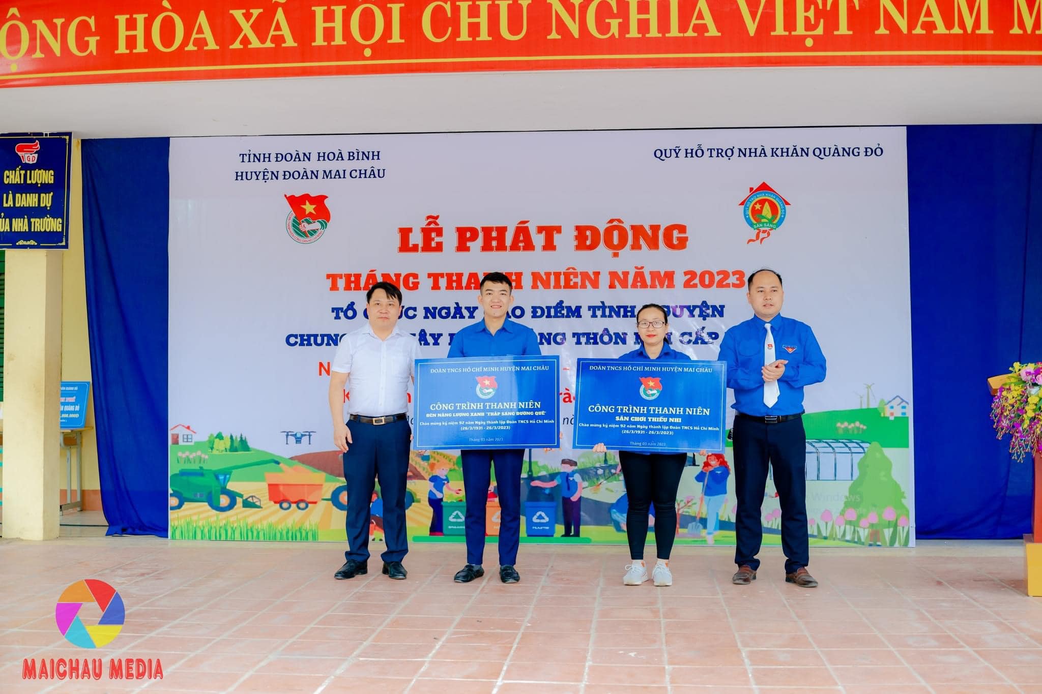 Tại buổi lễ, Ban Tổ chức đã tặng công trình Thanh niên đoạn đường Đèn năng lượng xanh “Thắp sáng đường quê” trị giá 30 triệu đồng tại xã Mai Hịch và 01 sân chơi thiếu nhi trị giá 20 triệu đồng tại xã Chiềng Châu; Tỉnh đoàn Hòa Bình và Quỹ hỗ trợ Nhà khăn quàng đỏ cùng chung tay hỗ trợ cho gia đình em học sinh Hà Thuý Nhàn, học sinh lớp 6 trường TH&THCS Nà Phòn, có hoàn cảnh khó khăn thuộc đối tượng hộ nghèo của xã Nà Phòn 25.000.000đ để xây dựng Nhà Khăn quàng đỏ; tặng 100 suất quà tặng cho 70 em học sinh vượt khó của trường TH&THCS Nà Phòn, 30 hộ gia đình có hoàn cảnh khó khăn trên địa bàn xã; tặng 10 suất quà cho các em Đội viên xuất sắc của trường, mỗi suất quà trị giá 300.000đ.