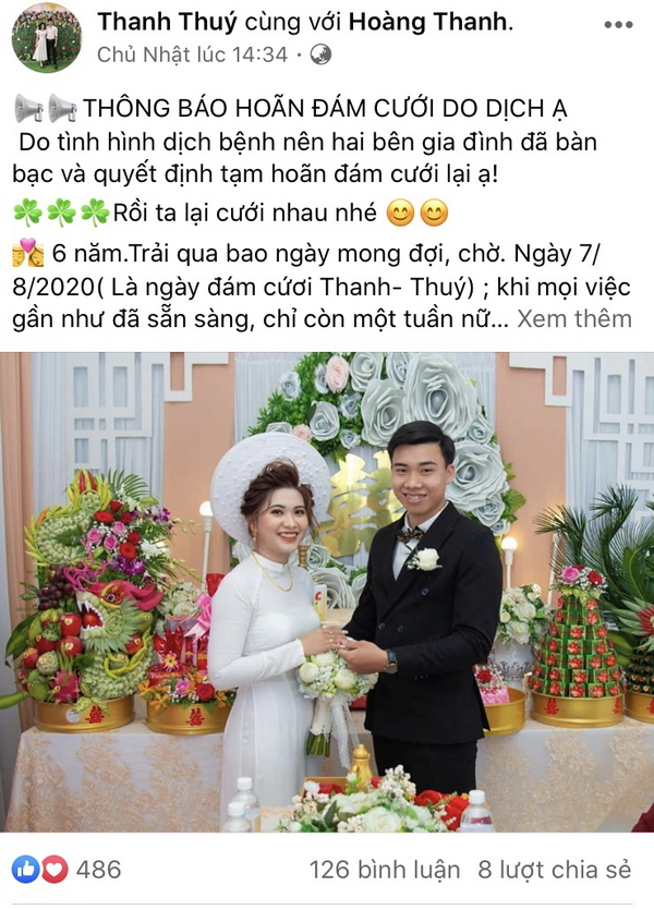 “Tụi em chuẩn bị xong tiệc cưới rồi và mong ngày thành hôn 8/8 sắp tới lắm nhưng giờ dịch tới thì hoãn cưới là việc đúng đắn mà mình nên làm. Cán bộ Đoàn phải làm gương ạ.Giờ tụi em cùng bà con làng xóm chống dịch thôi. Mong dịch bệnh qua mau để những đôi bạn trẻ yêu nhau như tụi em làm đám cưới và sống hạnh phúc”, Nhon chia sẻ.