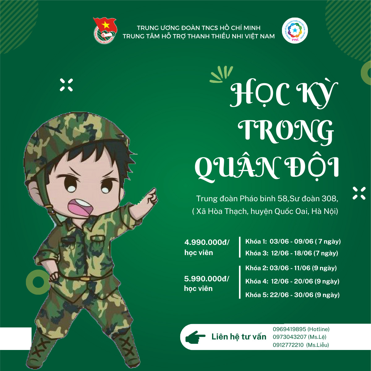 Được biết, Chương trình học kỳ Quân đội - Những bước chân Phù Đổng năm 2023 do Trung tâm Hỗ trợ Thanh thiếu nhi Việt Nam phối hợp với Trung đoàn 58 – Sư Đoàn 308 tổ chức sẽ diễn ra trong 5 khóa ,các học viên tham dự có độ tuổi từ 8 đến 16 tuổi đang sinh sống ở Hà Nội và các tỉnh thành trên cả nước. Khóa 1 (7 ngày) diễn ra từ ngày 03/6/2023 - 09/06/2023; Khóa 2 ( 9 ngày diễn ra từ ngày 03/06/2023-11/06/2023); Khóa 3, 7 ngày diễn ra từ ngày 12/6 - 18/6; Khóa 4, 9 ngày diễn ra từ ngày 12/6-20/6 và Khóa 5, 9 ngày diễn ra từ ngày 22/6-30/6 tại Trung đoàn 58 – Sư Đoàn 308 – Quân đoàn I (Quốc Oai, Hà Nội)./.
