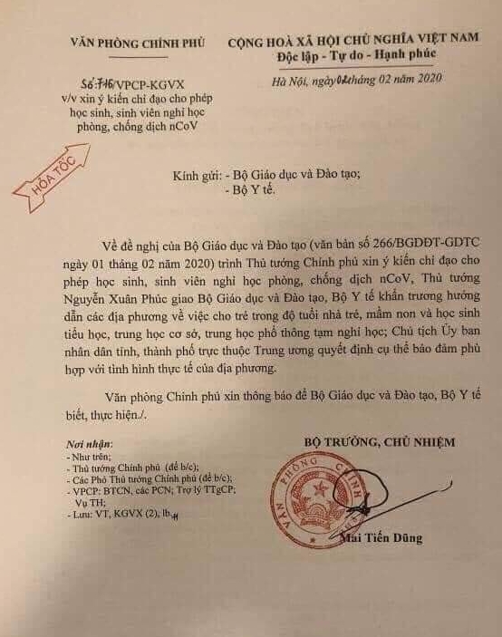 Cũng trong hôm nay 2/2, Văn phòng Chính phủ vừa có công văn số 716/VPCP-KGVX gửi Bộ GD-ĐT, Bộ Y tế về đề nghị của Bộ GD-ĐT trình Thủ tướng xin ý kiến chỉ đạo cho phép học sinh, sinh viên nghỉ học phòng chống dịch nCoV.