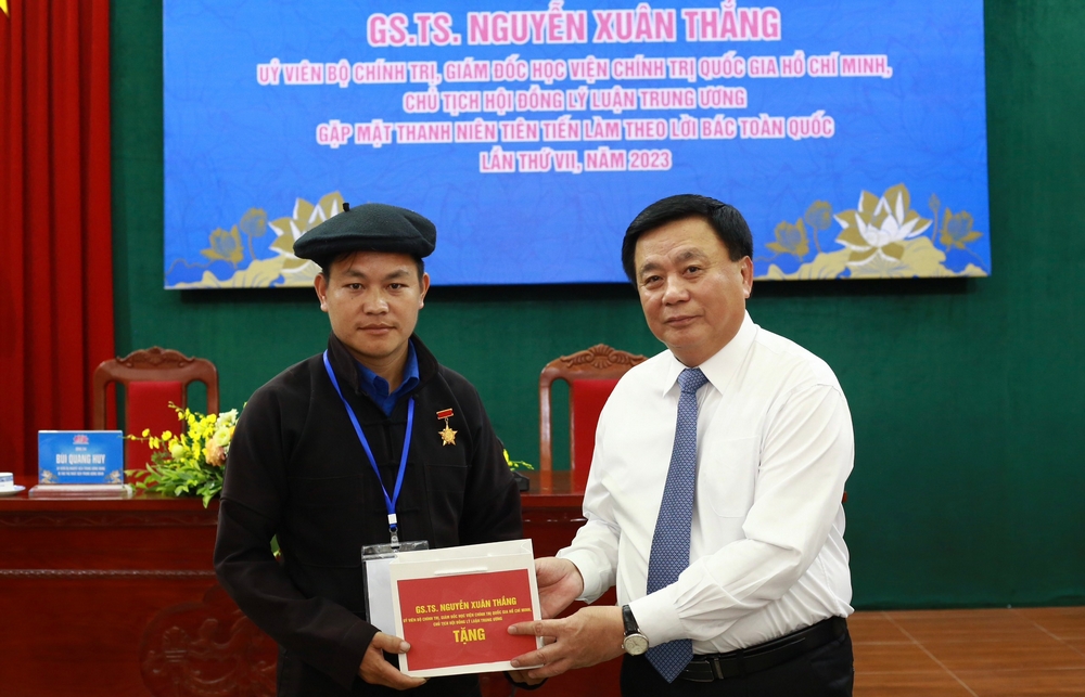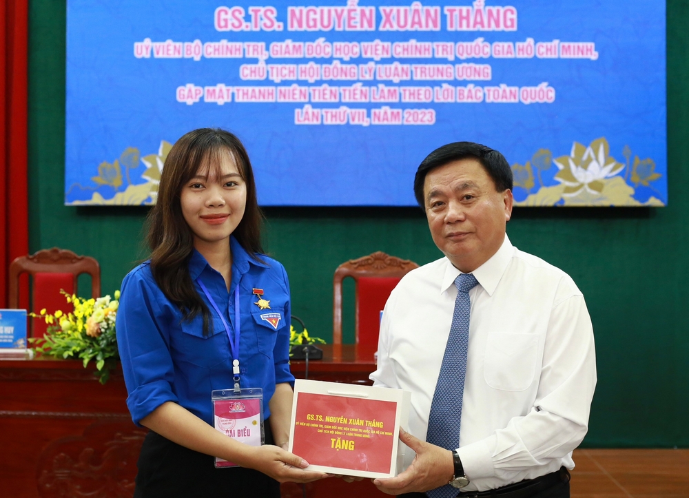 Nhân dịp này, GS.TS. Nguyễn Xuân Thắng - Ủy viên Bộ Chính trị, Giám đốc Học viện Chính trị Quốc gia Hồ Chí Minh, Chủ tịch Hội đồng Lý luận Trung ương đã tặng quà các đại biểu thanh niên tiên tiến.
