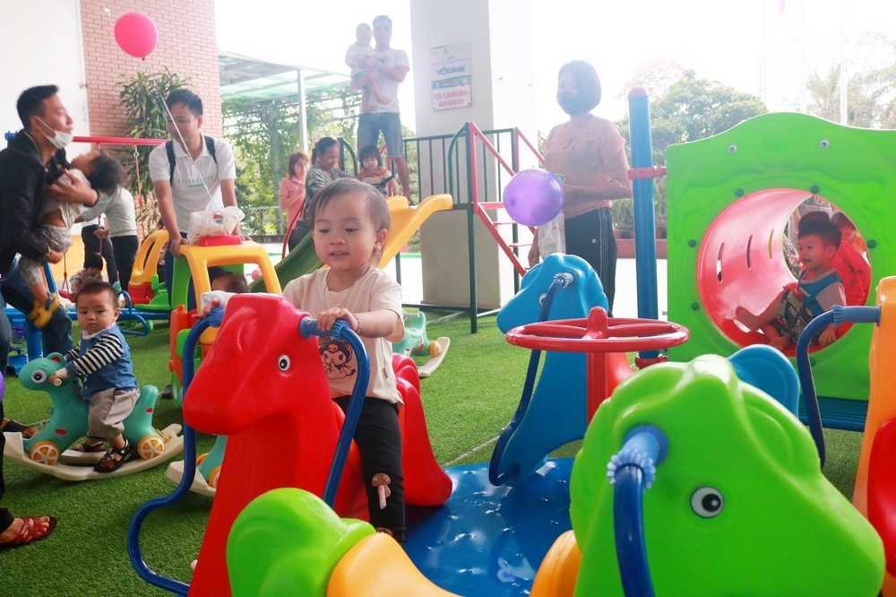 Tại Bệnh viện Nhi Thái Bình, khu vui chơi bao gồm: bập bênh, đu quay, cầu trượt, thú nhún, ô tô, hầm chui con sâu và thảm cỏ nhân tạo được bố trí sinh động, an toàn giúp cho các bệnh nhi đang điều trị tại Bệnh viện Nhi Thái Bình được thư giãn, vui chơi sau những giờ điều trị.