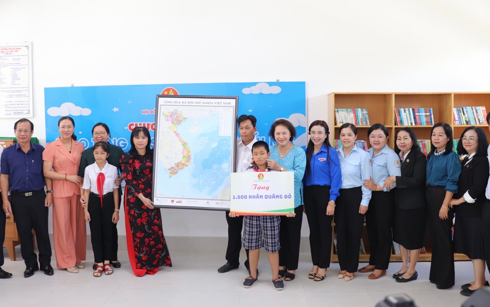 Trao tặng 1.500 khăn quàng đỏ là quà tặng của Thủ tướng Chính phủ cho thiếu nhi tỉnh Bến Tre và 30 bản đồ Việt Nam hưởng ứng Cuộc vận động Tự hào một dải non sông