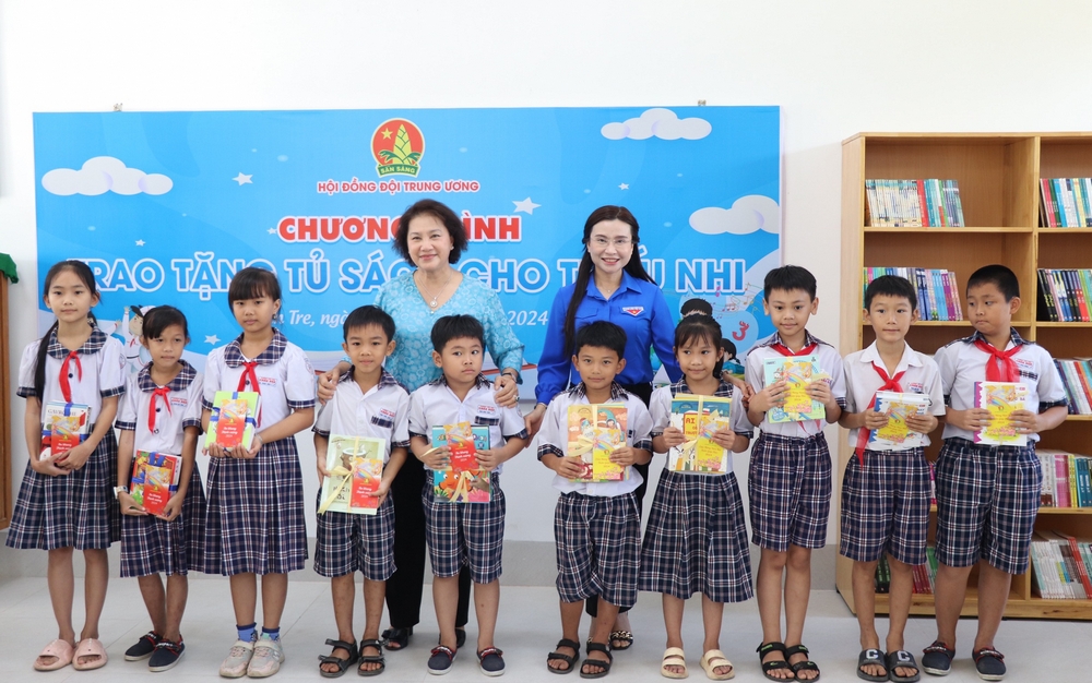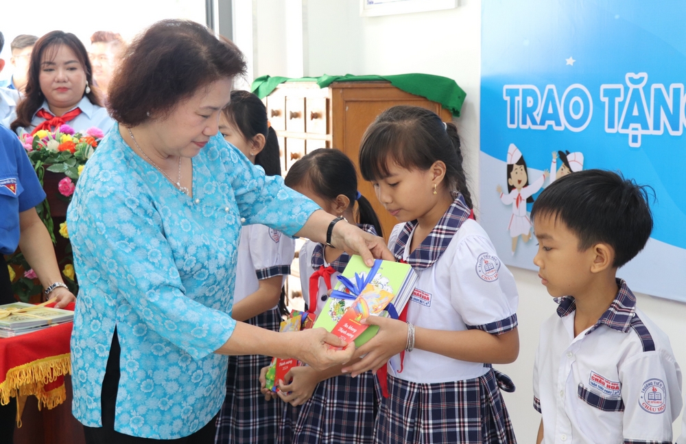 Nguyên Chủ tịch Quốc hội Nguyễn Thị Kim Ngân và Bí thư Trung ương Đoàn, Chủ tịch Hội đồng Đội Trung ương Nguyễn Phạm Duy Trang trao tặng 02 tủ sách cho thiếu nhi trường Tiểu học và THCS Châu Hòa