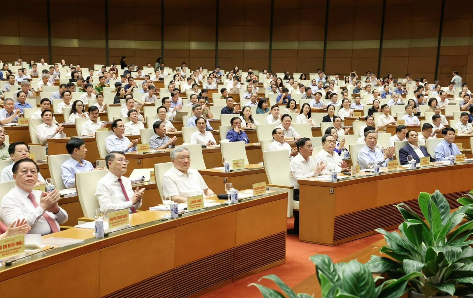 Chủ tịch nước Tô Lâm, Thủ tướng Phạm Minh Chính, Chủ tịch Quốc hội Trần Thanh Mẫn, Thường trực Ban Bí thư Lương Cường cùng nhiều đồng chí lãnh đạo cấp cao của Đảng, Nhà nước dự hội nghị tại Hội trường Diên Hồng, Nhà Quốc hội. Ảnh: Phương Hoa/TTXVN