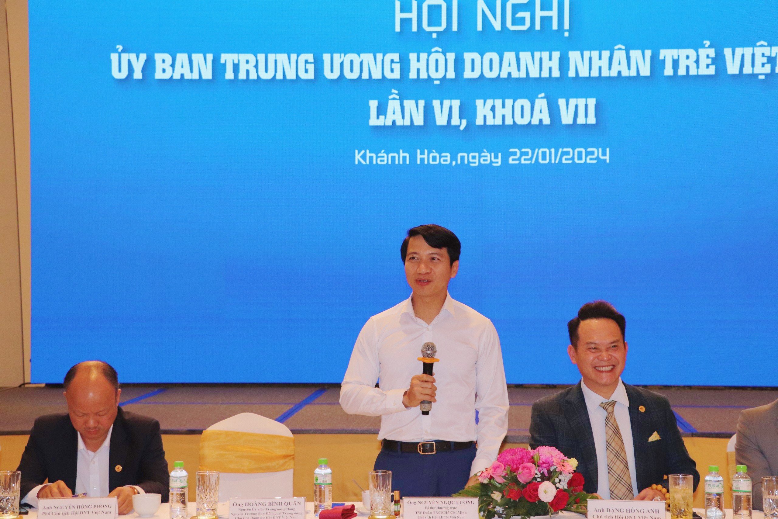 Phát biểu tại hội nghị, đồng chí Nguyễn Ngọc Lương, Chủ tịch Hội LHTN Việt Nam đề nghị Hội Doanh nhân trẻ Việt Nam tiếp tục phát huy những kết quả đã đạt được trong năm 2023; tổ chức triển khai thật tốt các nhiệm vụ trọng tâm năm 2024 của Hội, nhằm thúc đẩy và phát triển tổ chức Hội vững mạnh hơn. Đoàn TNCS Hồ Chí Minh, Hội LHTN Việt Nam sẽ tiếp tục đồng hành cùng Hội Doanh nhân trẻ Việt Nam trong công tác phát triển, củng cố tổ chức Hội; trong đó có việc xây dựng tổ chức hội địa phương vững mạnh hơn.