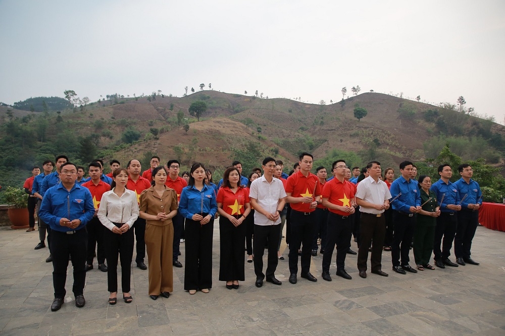 Các đồng chí lãnh đạo và cán bộ Đoàn, đoàn viên thanh niên thực hiện nghi lễ Chào cờ, dâng hương tại Ngã ba Cò Nòi
