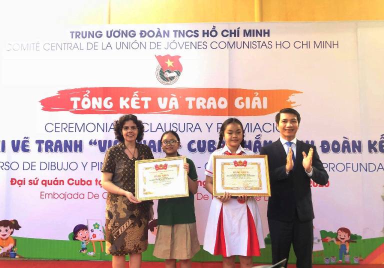 Chị Nguyễn Phạm Duy Trang, Ủy viên Ban Thường vụ, Trưởng ban Công tác Thiếu nhi Trung ương Đoàn, Phó Chủ tịch Thường trực Hội đồng Đội Trung ương; anh Nguyễn Hải Minh, Ủy viên Ban Thường vụ, Trưởng ban Quốc tế Trung ương Đoàn, Phó Chủ tịch Hội Liên hiệp Thanh niên Việt Nam, Ủy viên Hội Hữu nghị Việt Nam - Cuba trao giải Nhì cho các em thiếu nhi đạt giải.