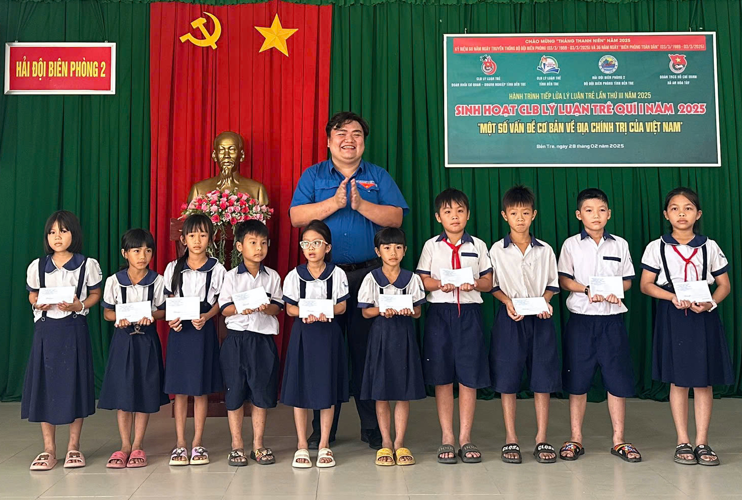 Dịp này, CLB Lý luận trẻ tỉnh tặng 20 suất học bổng (mỗi suất 500 ngàn đồng) cho con em của cán bộ, chiến sĩ Hải đội và học sinh tiểu học vượt khó học tốt trên địa bàn xã. CLB Lý luận trẻ Đoàn Khối Cơ quan - Doanh nghiệp tỉnh tặng 01 công trình Tủ sách Cố Tổng Bí thư Nguyễn Phú Trọng gồm 15 tác phẩm sách, kinh phí 4 triệu đồng. Ngoài ra CLB Lý luận trẻ tỉnh còn trang bị dụng cụ phân loại rác thải tại nguồn và tặng thuốc xông phòng, trị cảm cúm cho Hải đội và nhân dân trên địa bàn xã.