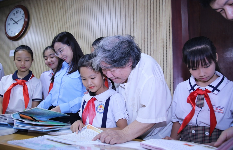 Bí thư T.Ư Đoàn, Chủ tịch Hội đồng Đội Trung ương Nguyễn Phạm Duy Trang và GS Lê Văn Lan - Trưởng Ban giám khảo cuộc thi cùng các em thiếu nhi xem các tác phẩm tiêu biểu