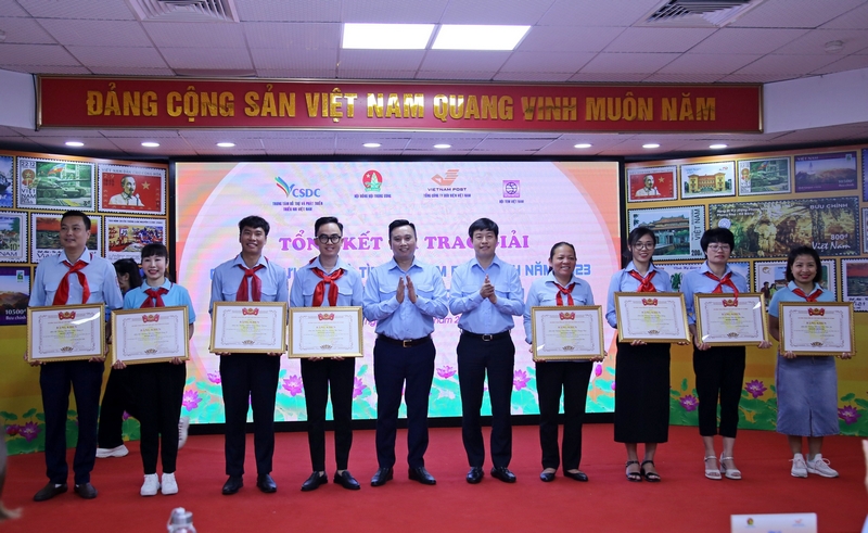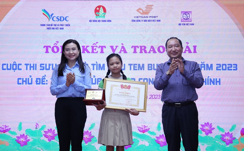 Đồng chí Lê Hải Long - Ủy viên BTV, Trưởng Ban Công tác thiếu nhi T.Ư Đoàn, Phó Chủ tịch thường trực Hội đồng Đội T.Ư và bà Ngô Hoài Thanh, Trưởng Ban Tem Bưu chính, Tổng công ty Bưu điện Việt Nam trao giải Nhất cho tác giả