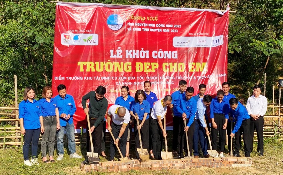 Đồng chí Đoàn Văn Tuấn - Bí thư Đoàn Thanh niên Ngân hàng Bắc Á trao biển hỗ trợ kinh phí xây dựng 10 công trình “Nhà vệ sinh cho em” trị giá 600 triệu đồng và 01 công trình “Trường đẹp cho em” tại điểm trường Khu tái định cư xóm Bưa Cốc thuộc trường Tiểu học Nánh Nghê, xã Nánh Nghê, huyện Đà Bắc, tỉnh Hòa Bình trị giá 350 triệu đồng.