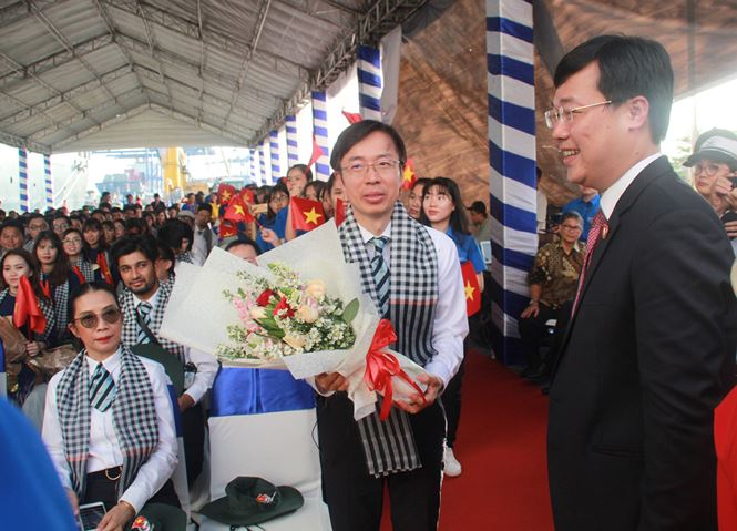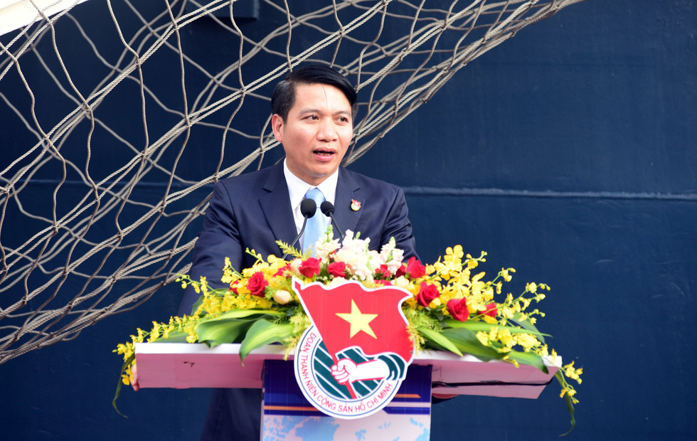 Đồng chí Nguyễn Ngọc Lương - Bí thư trung ương Đoàn, Phó Chủ nhiệm Thường trực Ủy ban quốc gia về thanh niên Việt Nam phát biểu tại lễ đón tàu - Ảnh TTO