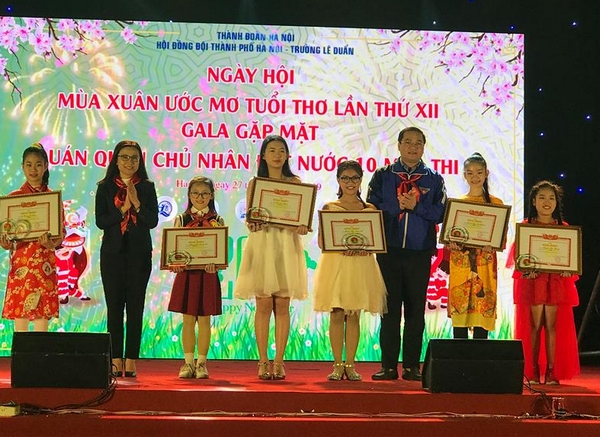 Phó Chủ tịch Thường trực Hội đồng Đội Trung ương Nguyễn Phạm Duy Trang và Bí thư Thành Đoàn Hà Nội Nguyễn Ngọc Việt trao giải cho các thí sinh tại đêm Gala