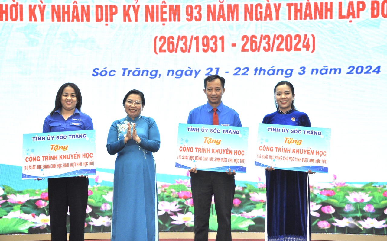 Dịp này, Ban Thường vụ Tỉnh ủy Sóc Trăng tặng 01 công trình an sinh xã hội trị giá 30 triệu đồng cho các em học sinh có hoàn cảnh khó khăn của 3 tỉnh, thành: Sóc Trăng - Cần Thơ - Hậu Giang, mỗi đơn vị 10 suất học bổng từ nguồn kinh phí Hội Khuyến học tỉnh Sóc Trăng.