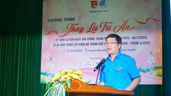 Đồng chí Nguyễn Thanh Hoài, UVBCH Trung ương Đoàn, Bí thư Thành đoàn, Chủ tịch Hội LHTN Việt Nam thành phố xúc động phát biểu tri ân, ân cần thăm hỏi tình hình sức khỏe, đời sống và bày tỏ lòng biết ơn sâu sắc của tuổi trẻ thành phố Huế đối với những cống hiến, hy sinh quên mình vì sự nghiệp đấu tranh giải phóng dân tộc, thống nhất đất nước của các Anh hùng liệt sĩ, những người có công với cách mạng.
