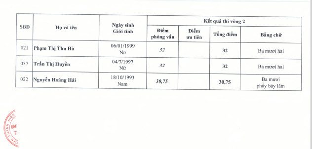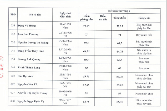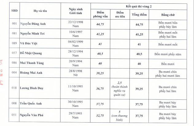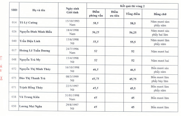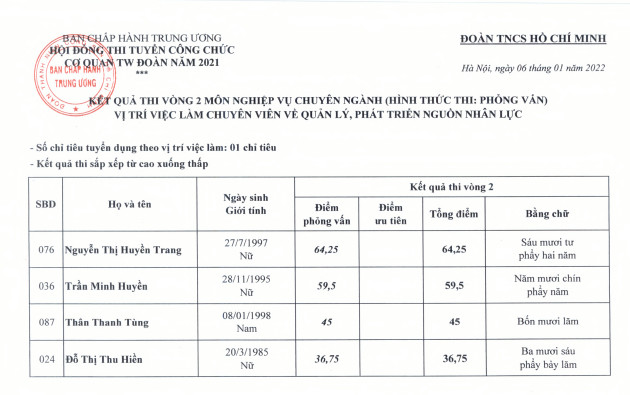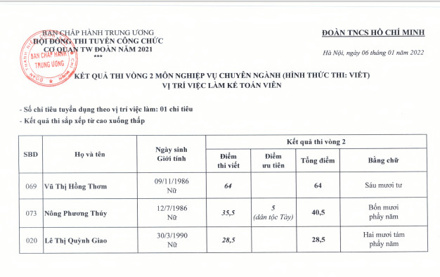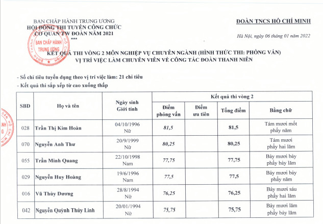Kết quả thi vòng 2 kỳ thi tuyển công chức cơ quan TƯ Đoàn năm 2021
