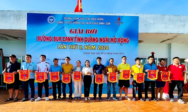 Tặng cờ lưu niệm cho các đoàn tham gia giải bơi.