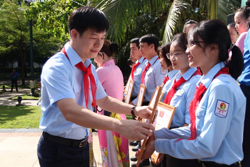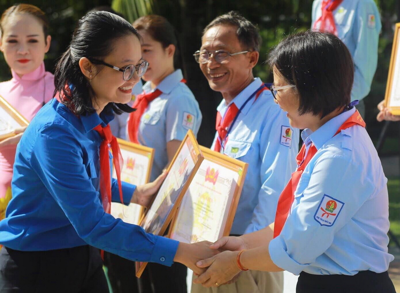 Đồng chí Trần Thu Hà - Phó Bí thư Thành Đoàn TP. Hồ Chí Minh, Chủ tịch Hội đồng Đội Thành phố trao tặng Bằng khen của Hội đồng Đội Trung ương cho các gương phụ trách Đội giỏi cụm miền Đông Nam Bộ