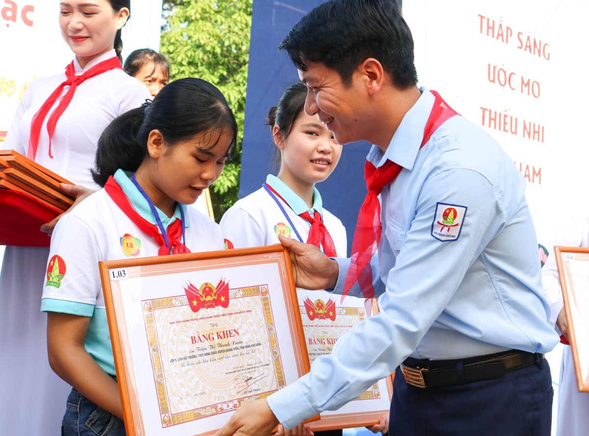 Anh Nguyễn Ngọc Lương, Bí thư Trung ương Đoàn, Chủ tịch Hội đồng Đội Trung ương trao Bằng khen BCH Trung ương Đoàn TNCS Hồ Chí Minh cho các thiếu nhi nghèo vượt khó