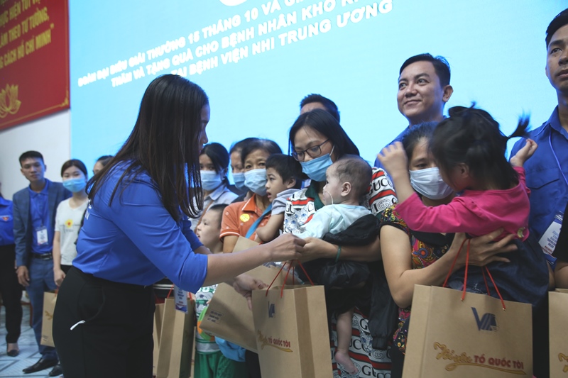 Bên cạnh đó, các đại biểu được tuyên dương Giải thưởng 15/10 và Gương Thanh niên sống đẹp đã đến thăm và tặng quà cho bệnh nhi tại Bệnh viện Nhi Trung ương và Viện Huyết học truyền máu Trung ương.