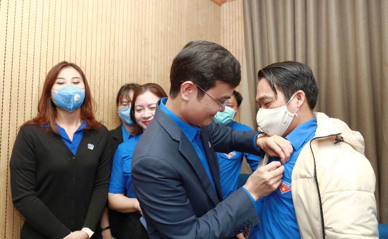 Đoàn Thanh niên cơ quan Trung ương Đoàn cài Huy hiệu kỷ niệm 90 năm ngày thành lập Đoàn TNCS Hồ Chí Minh cho Bí thư thứ nhất Trung ương Đoàn Nguyễn Anh Tuấn