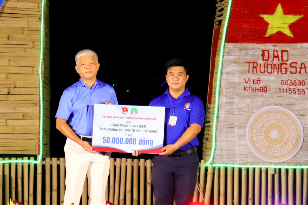Nhân dịp này, Tỉnh đoàn Khánh Hòa và Công ty Cổ phần Năng lượng Resa đã trao tặng công trình thanh niên “Đoạn đường bê tông từ rác thải nhựa” với tổng trị giá 50 triệu đồng cho Thành đoàn Nha Trang.