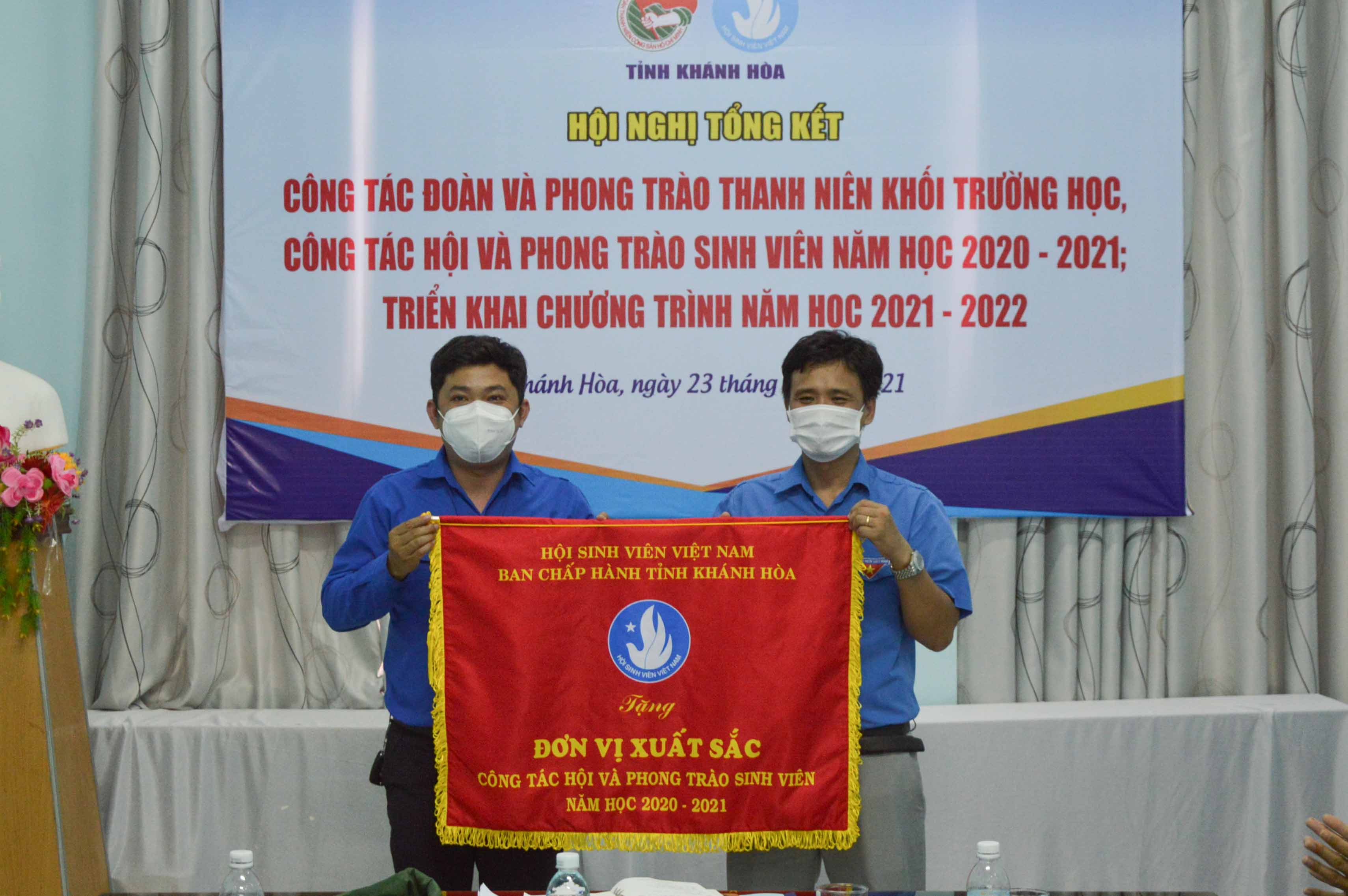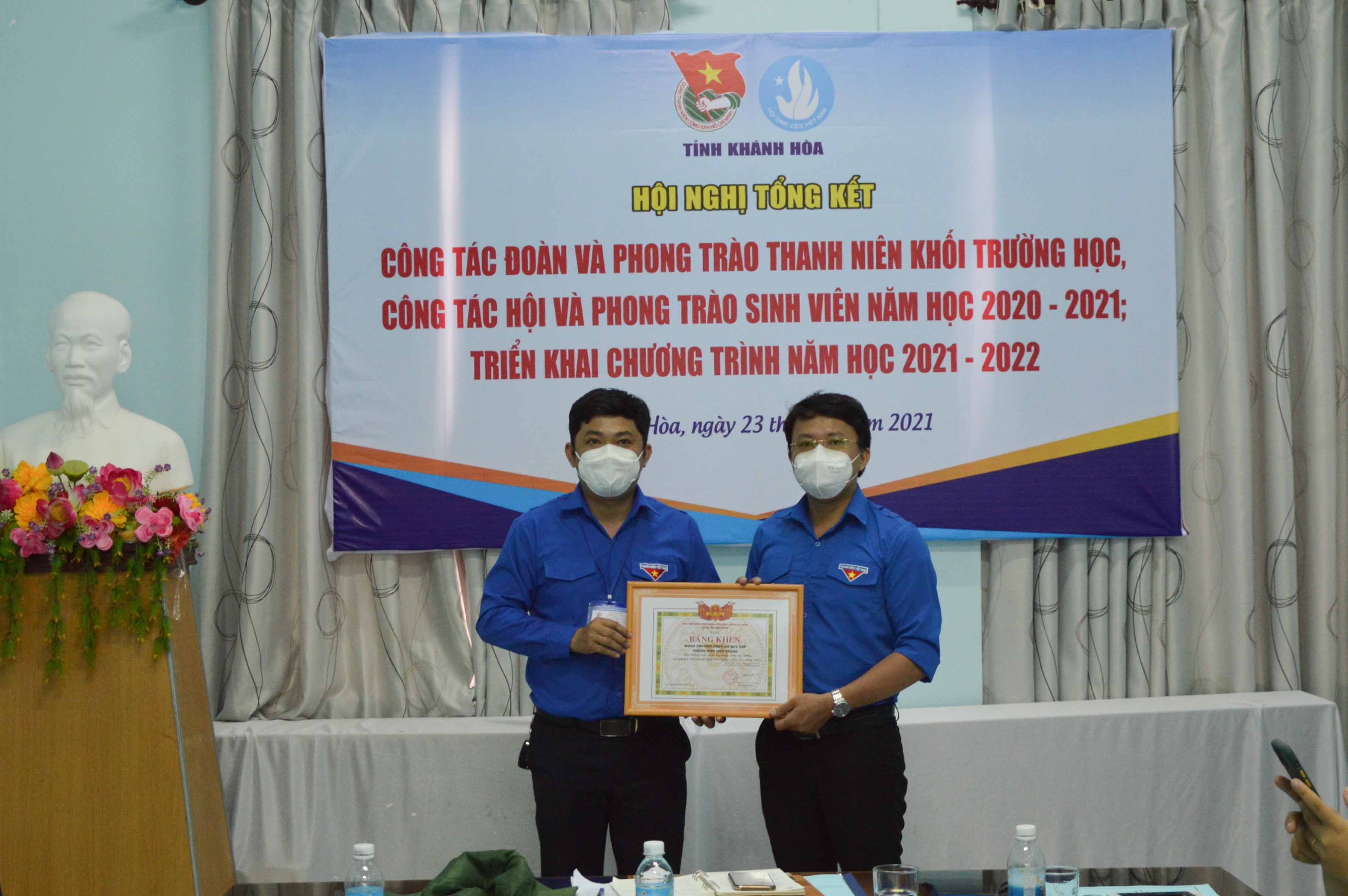 Dịp này, Ban Thường vụ Tỉnh đoàn tặng cờ thi đua “Đơn vị xuất sắc trong công tác Đoàn và phong trào thanh niên trường học năm học 2020 – 2021” cho Đoàn trường CĐ Kỹ thuật Công nghệ Nha Trang; tặng bằng khen cho 05 “Đơn vị xuất sắc trong công tác Đoàn và phong trào thanh niên trường học năm học 2020 – 2021”: Đoàn trường ĐH Khánh Hòa, Đoàn trường ĐH Nha Trang, Đoàn trường CĐ Du lịch Nha Trang, Đoàn trường CĐ Sư phạm Trung ương Nha Trang, Đoàn trường CĐ Y tế Khánh Hòa và tặng bằng khen cho 10 tập thể, 31 cá nhân có thành tích xuất sắc trong công tác Đoàn và phong trào thanh niên trường học năm học 2020 – 2021.