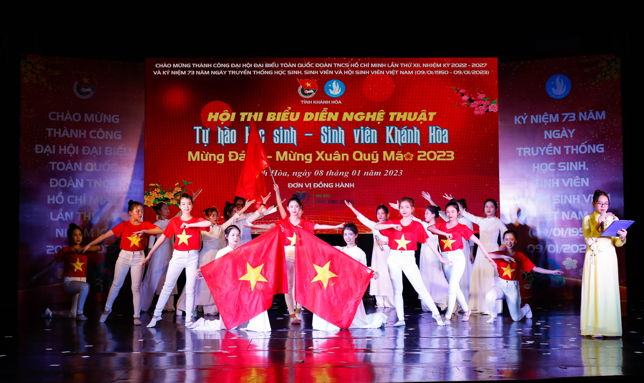 Hội thi biểu diễn nghệ thuật “Tự hào Học sinh - Sinh viên Khánh Hòa”, mừng Đảng – Mừng Xuân Quý Mão 2023 diễn ra sôi nổi với sự tham gia của 15 đội đến từ các trường đại học, cao đẳng, THPT, Trung tâm giáo dục thường xuyên - hướng nghiệp trên địa bàn tỉnh. Các tiết mục văn nghệ ca ngợi về Đảng, Bác Hồ, tình yêu quê hương, đất nước, mừng Đảng - mừng Xuân, mừng đất nước đổi mới.