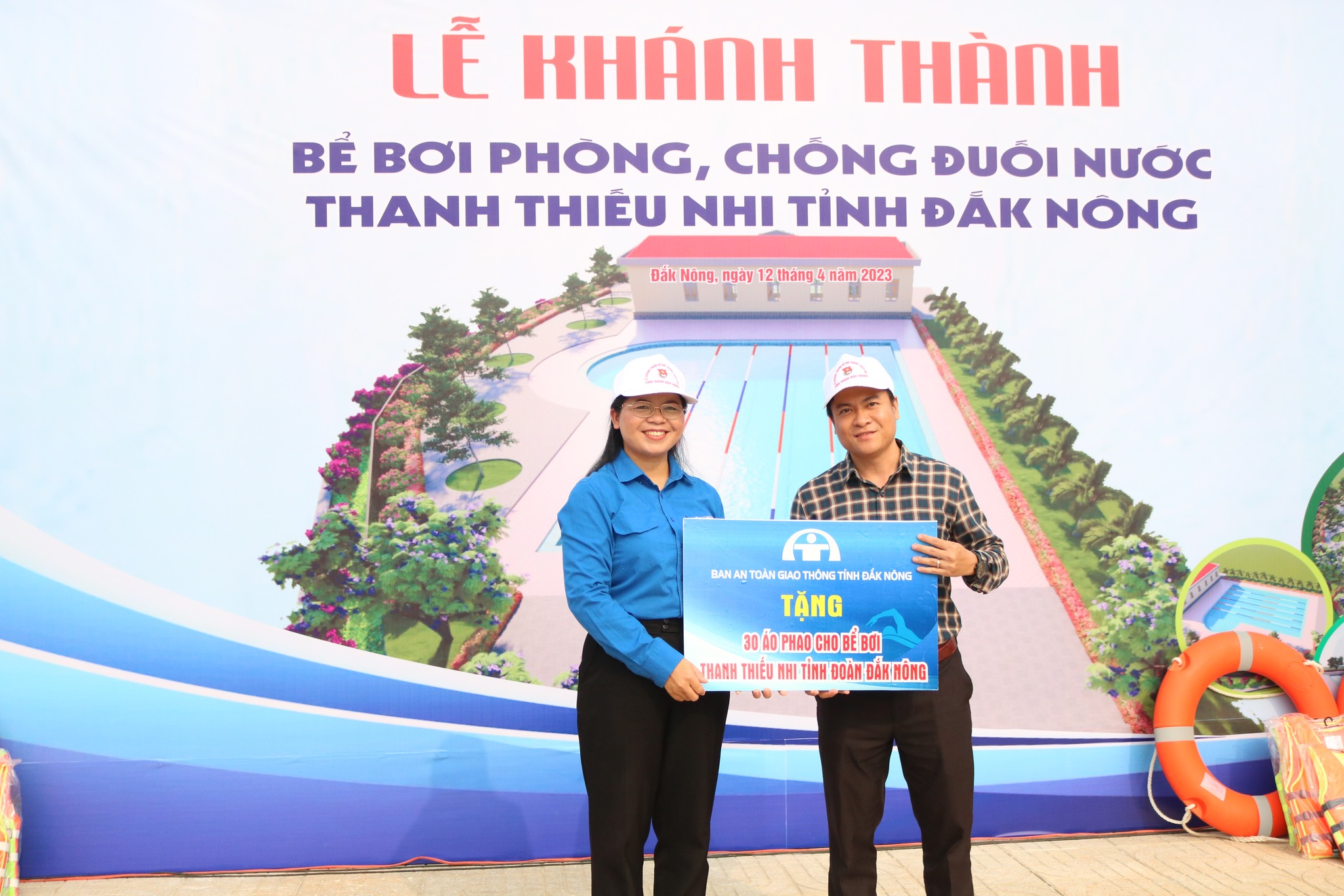 Nhân dịp này, Sở Giao thông vận tải trao tặng 10 phao cứu hộ; Ban An toàn giao thông tỉnh tặng 30 áo phao; Đoàn đại biểu tỉnh Đắk Nông dự Đại hội Đoàn toàn quốc lần thứ XII trao tặng trang thiết bị trị giá 10 triệu đồng cho bể bơi thanh thiếu nhi tỉnh.