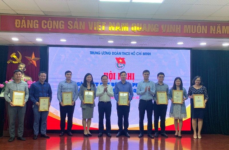 Đồng chí Nguyễn Anh Tuấn - Bí thư thường trực T.Ư Đoàn, Chủ tịch T.Ư Hội LHTN Việt Nam và đồng chí Bùi Quang Huy - Bí thư T.Ư Đoàn, Chủ tịch T.Ư Hội Sinh viên Việt Nam trao chứng nhận cho 10 cá nhân xuất sắc trong quý III