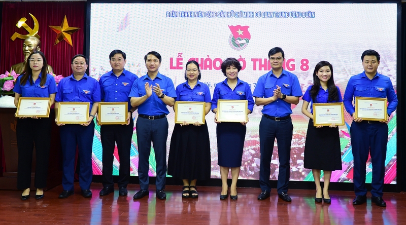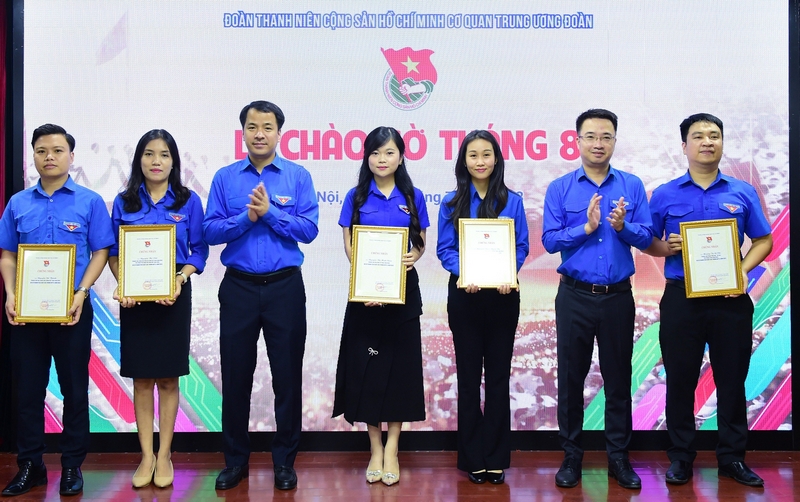 Đồng chí Bùi Quang Huy, Ủy viên dự khuyết T.Ư Đảng, Bí thư thứ nhất T.Ư Đoàn; đồng chí Nguyễn Ngọc Lương, Bí thư thường trực T.Ư Đoàn, Chủ tịch Hội LHTN Việt Nam trao khen thưởng 7 đơn vị hoàn thành xuất sắc nhiệm vụ trong quý II