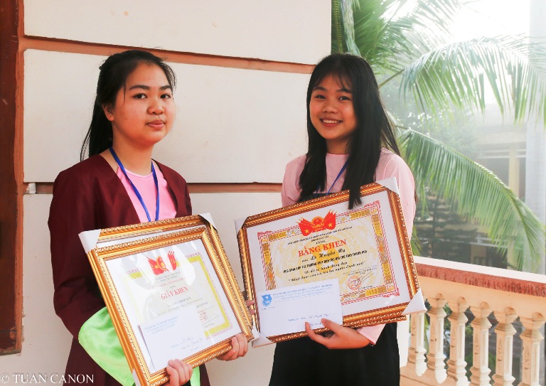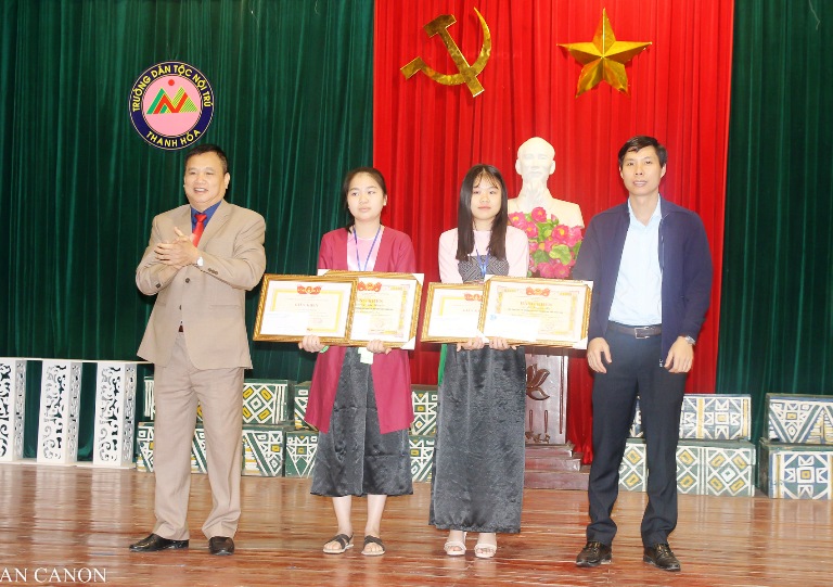 Đồng chí Nguyễn Hữu Tuất, Phó Bí thư Tỉnh đoàn, chủ tịch Hội đồng Đội tỉnh và đồng chí Trần Văn Hòa, Phó giám đốc Sở Giáo dục và Đào tạo tặng giấy khen và phần thưởng cho cho hai em Lương Thị Huyền và Lê Huyền My - học sinh lớp sinh 10E Trường THPT Dân tộc Nội trú tỉnh Thanh Hóa