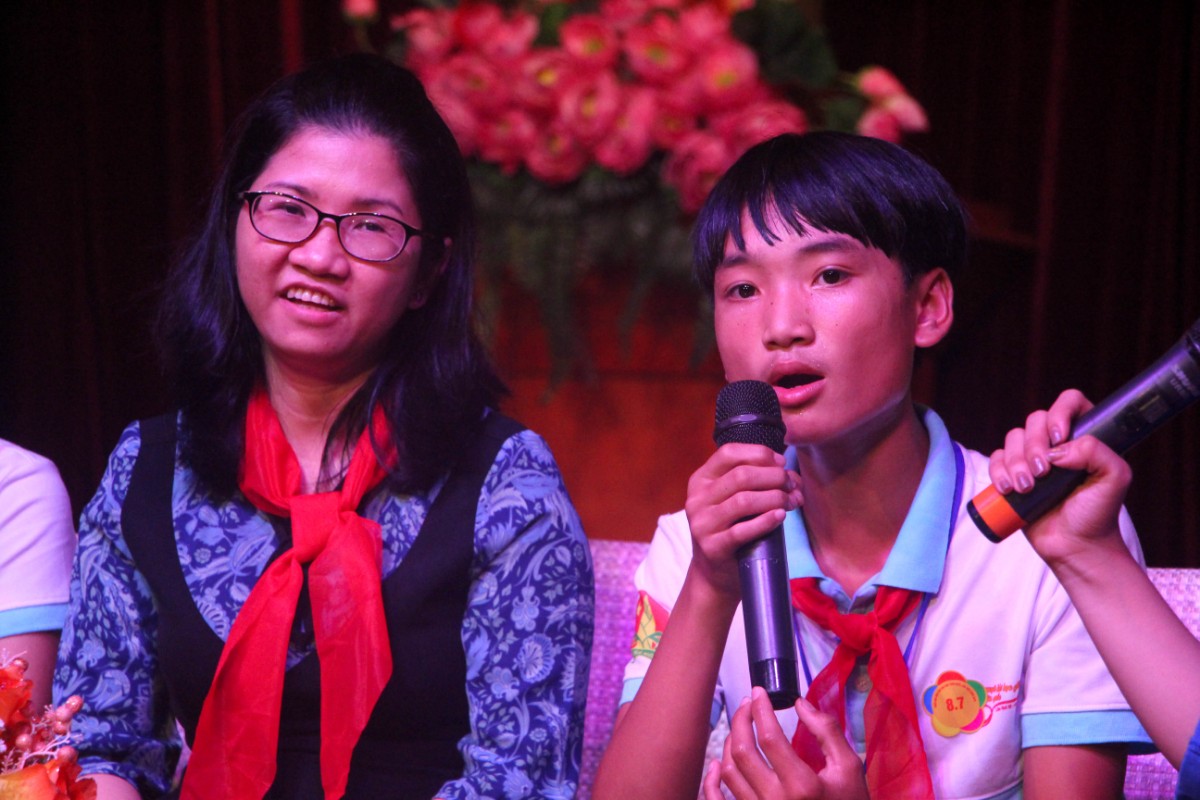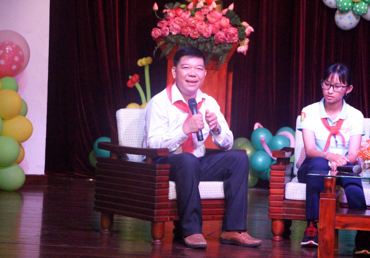 Bạn Lưu Nguyễn Ngọc Châu (bên phải) cho biết, bạn rất tâm đắc với câu chuyện và lời nhắn nhủ của thầy Nguyễn Văn Cải - Phó Hiệu trưởng trường THPT Quang Trung (bên trái) trong chương trình "Thắp sáng ước mơ" ở Nhà thiếu nhi quận Tân Phú vào tối 14/6. Câu chuyện của Thầy Cải tiếp thêm niềm tin tương lai cho Châu trong hành trình rèn luyện sắp tới