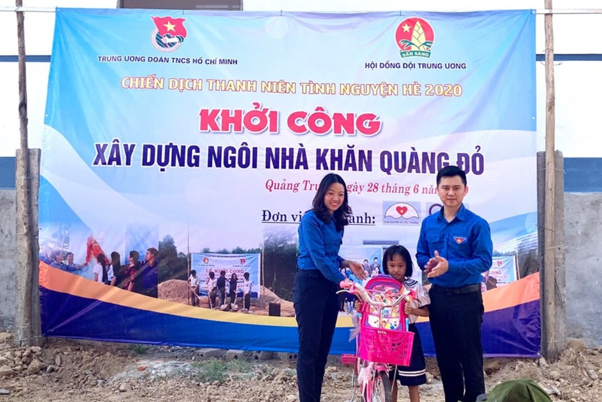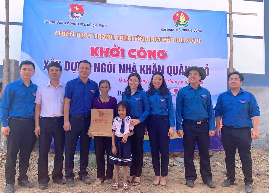 Web.ĐTN: Nằm trong chuỗi hoạt động Lễ ra quân chiến dịch Thanh niên tình nguyện Hè 2020, sáng 28/6, Trung ương Đoàn, Hội Đồng đội Trung ương đã tổ chức khởi công, trao tặng ngôi nhà Khăn Quàng đỏ cho em Mai Thị Kim Chi, học sinh lớp 2B, Trường Tiểu học Quảng Trung, xã Quảng Trung, thị xã Ba Đồn, Quảng Bình.