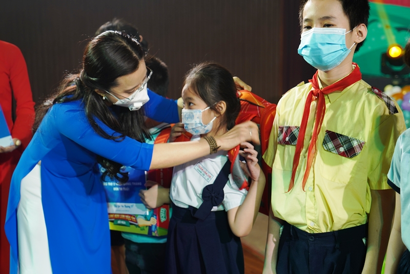 Chị Nguyễn Phạm Duy Trang - Bí thư Trung ương Đoàn, Phó Chủ tịch thường trực Hội đồng Đội Trung ương trao bảo trợ dài hạn cho các em mồ côi cha mẹ do Covid-19 tại TP HCM và một số tỉnh phía Nam