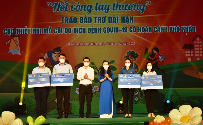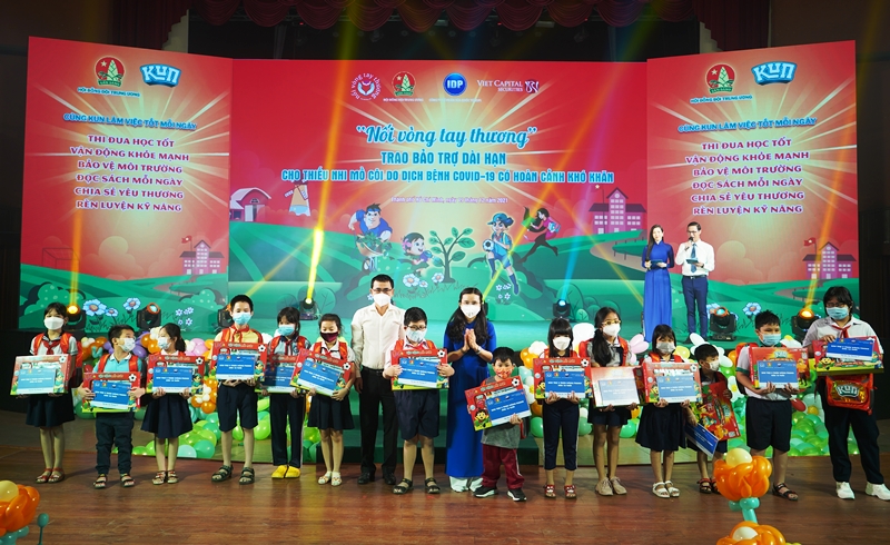 Nhân dịp này, Hội đồng Đội Trung ương, Công ty Cổ phần Sữa Quốc tế (IDP) - nhãn hàng Sữa Kun và Công ty Cổ phần Chứng khoán Bản Việt đã trao bảo trợ đợt 2 cho 204 em thiếu nhi mồ côi cha mẹ do dịch bệnh Covid-19, trong đó có 19 em là thiếu nhi trên địa bàn TP HCM. Đây là các suất bảo trợ dài hạn với mức hỗ trợ 2 triệu đồng/tháng cùng với các gói hỗ trợ, chăm lo khác của chương trình “Nối vòng tay thương” do Ban Bí thư Trung ương Đoàn phát động. Được biết, đợt 1 diễn ra vào tháng 10/2021 đã trao bảo trợ cho 301 em học sinh mồ côi do Covid-19.