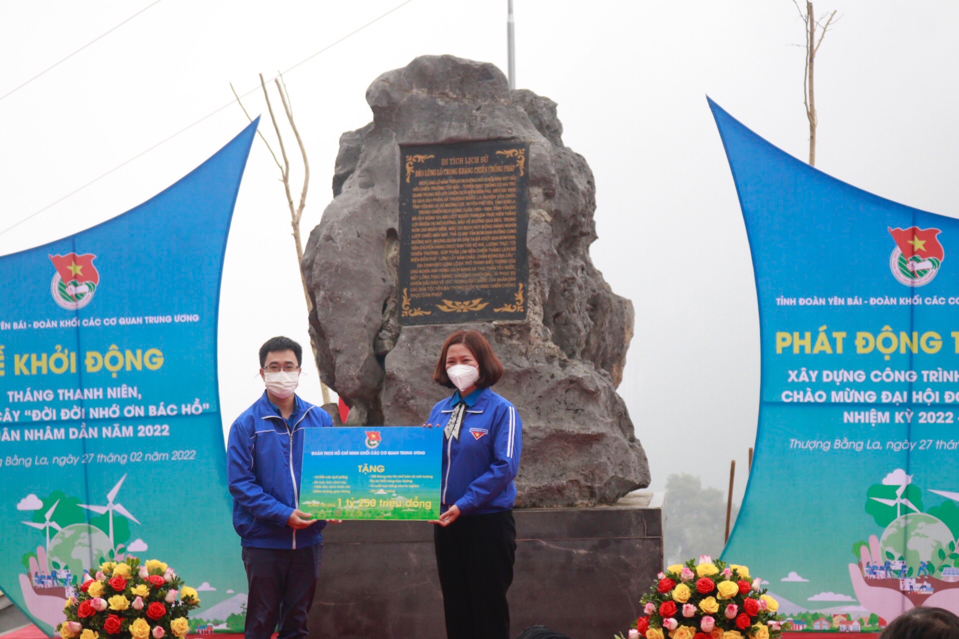 Nhân dịp này, Đoàn khối Cơ quan Trung ương trao hỗ trợ các công trình, phần việc tại tỉnh Yên Bái với tổng kinh phí trên 1 tỷ 250 triệu đồng. Các huyện, thị, thành Đoàn và Đoàn trực thuộc; Hội đồng đội các huyện, thị, thành phố; các Doanh nghiệp trên địa bàn tỉnh trao biển hỗ trợ công trình thanh niên cấp tỉnh năm 2022 với tổng trị giá 2 tỷ 730 triệu đồng.