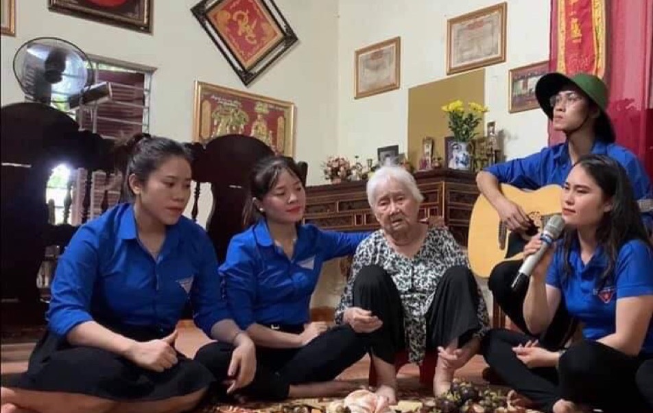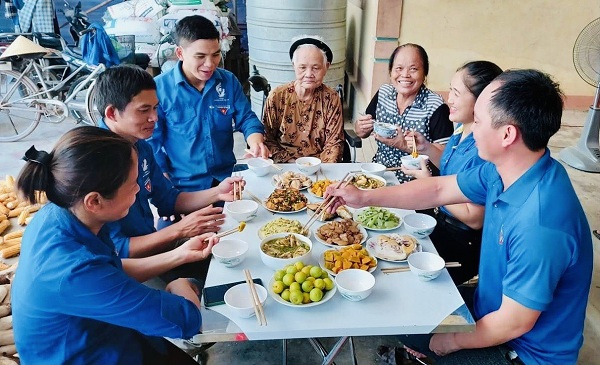 Những bữa cơm đầm ấm tại nhà các Mẹ liệt sỹ nay có thêm cả màu áo xanh tình nguyện, đầy ắp tiếng cười nói. Ảnh: Huyện đoàn Thanh Chương