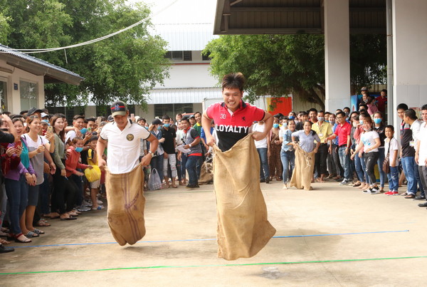 Thanh niên công nhân tham gia trò chơi nhảy bao bố tại ngày hội “Tiếp sức thanh niên công nhân, người lao động” năm 2020.