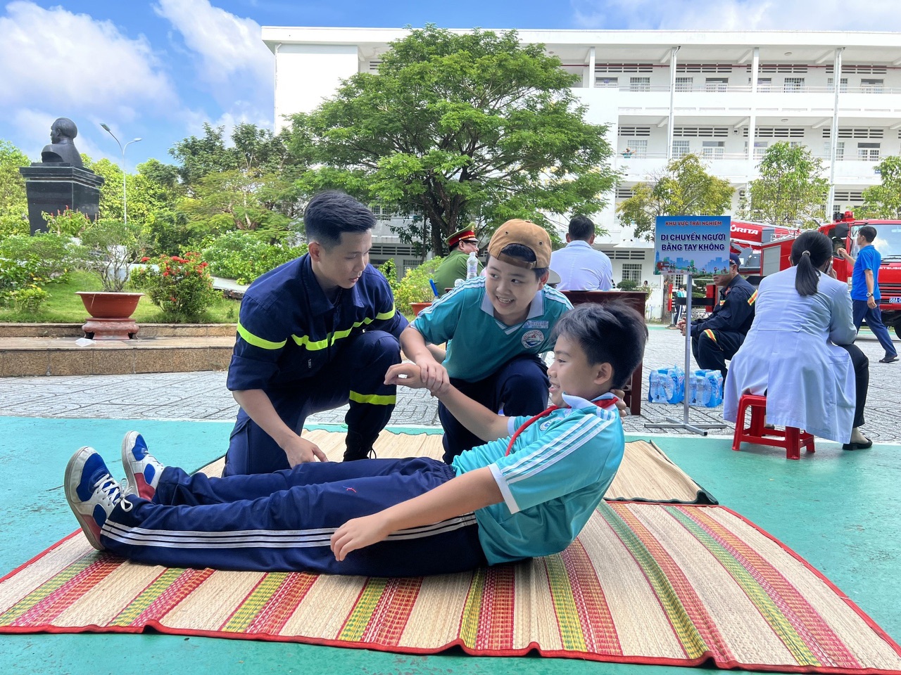 Đặt biệt, chương trình trải nghiệm thực tế “Chúng em làm lính cứu hỏa” đã được tổ chức với nhiều hoạt động ý nghĩa, thiết thực và sôi nổi với nhiều hoạt động như: Tuyên truyền, phổ biến pháp luật, kiến thức cơ bản và các biện pháp bảo đảm an toàn PCCC; giới thiệu một số phương tiện, trang thiết bị phục vụ công tác chữa cháy, CNCH: quần, áo, mũ, ủng, lăng, vòi, các thiết bị chữa cháy, CNCH cơ bản trang bị trên các xe ôtô chữa cháy, CNCH...;  truyền, phổ biến pháp luật, kiến thức cơ bản và các biện pháp bảo đảm an toàn PCCC; giới thiệu một số phương tiện, trang thiết bị phục vụ công tác chữa cháy, CNCH: quần, áo, mũ, ủng, lăng, vòi, các thiết bị chữa cháy, CNCH cơ bản trang bị trên các xe ôtô chữa cháy, CNCH...; Giả định tình huống cháy (tại tầng 2 khu vực phòng học) và triển khai các hoạt động chữa cháy, thoát nạn, cứu người: Triển khai đội hình trên xe ô tô chữa cháy phun nước chữa cháy; hướng dẫn cho các em học sinh thực hành thoát nạn theo cầu thang bộ, dây hạ chậm, đội hình cứu người bị nạn từ trên cao...