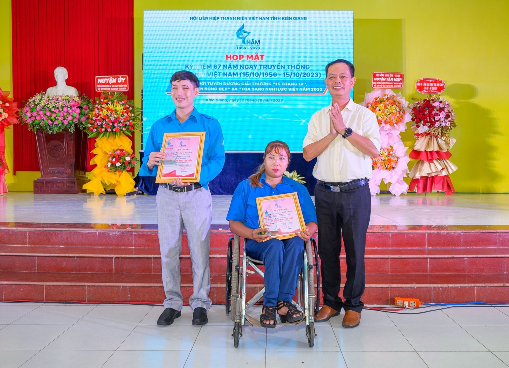 Dịp này, Ủy ban Hội tỉnh tổ chức tuyên dương 25 cán bộ Hội, Hội viên, thanh niên tiêu biểu được nhận Giải thưởng “15 tháng 10”, Giải thưởng “Thanh niên sống đẹp” và Giải thưởng “Tỏa sáng Nghị lực Việt” năm 2023; Trao bằng khen 7 cá nhân có thành tích xuất sắc tham gia trại Nguyễn Chí Thanh, huấn luyện viên cấp I Trung ương Hội Liên hiệp Thanh niên Việt Nam; Ban Chấp hành Tỉnh đoàn Kiên Giang tặng bằng khen 4 đoàn viên, thanh niên có thành tích xuất sắc trong hội thi tin học trẻ toàn quốc năm 2023 và trao giải cuộc thi “Thách thức để thay đổi”.