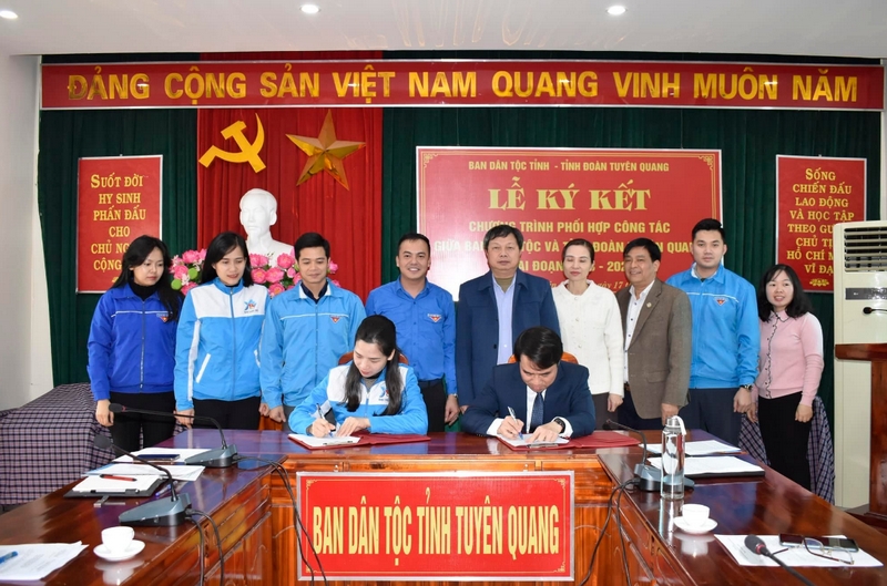 Tại chương trình, 02 đơn vị đã thông qua Chương trình phối hợp công tác giữa Ban Dân tộc và Tỉnh đoàn Tuyên Quang giai đoạn 2023 - 2025, trong đó có một số nội dung trọng tâm như: phối hợp tuyên truyền, vận động đoàn viên, thanh niên và nhân dân thực hiện các chính sách của Nhà nước về công tác dân tộc, gắn với tuyên truyền về giảm thiểu tình trạng tảo hôn và hôn nhân cận huyết thống trong vùng đồng bào dân tộc thiểu số; triển khai Chương trình mục tiêu quốc gia phát triển kinh tế - xã hội vùng đồng bào dân tộc thiểu số và miền núi giai đoạn 2021-2025; triển khai phong trào “Tuổi trẻ chung tay xây dựng nông thôn mới” với các nội dung tuyên truyền về xây dựng nông thôn mới, giảm tỷ lệ hộ thanh niên nghèo, hỗ trợ thanh niên khởi nghiệp, lập nghiệp; các cấp bộ Đoàn và cơ quan công tác dân tộc các cấp phối hợp nhận đỡ đầu một số xã, thôn, bản thực hiện chỉ tiêu trong Chương trình mục tiêu quốc gia là tỷ lệ hộ nghèo trong đồng bào dân tộc thiểu số…