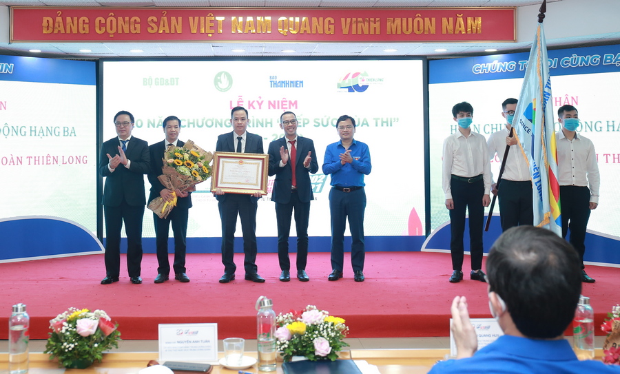 Đồng chí Nguyễn Anh Tuấn, Ủy viên BCH TƯ Đảng, Bí thư thứ nhất TƯ Đoàn, đồng chí Hoàng Bình Quân, Nguyên Ủy viên BCH TƯ Đảng, Nguyên Trưởng ban Đối ngoại TƯ trao Huân chương Lao động hạng Ba, tặng hoa chúc mừng tập thể Tập đoàn Thiên Long