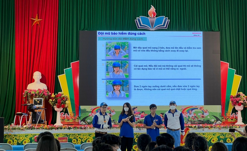 Các em học sinh còn được hướng dẫn và tham gia thực hành cách đội mũ bảo hiểm, ngồi trên xe máy, lái trên đường đúng cách, thực hành lái xe an toàn trên mô hình qua đó trang bị cho các em những kỹ năng khi tham gia giao thông và biết cách ứng xử, đối phó với các tình huống đi trên đường, hình thành văn hóa giao thông ngay từ khi còn trên ghế nhà trường.