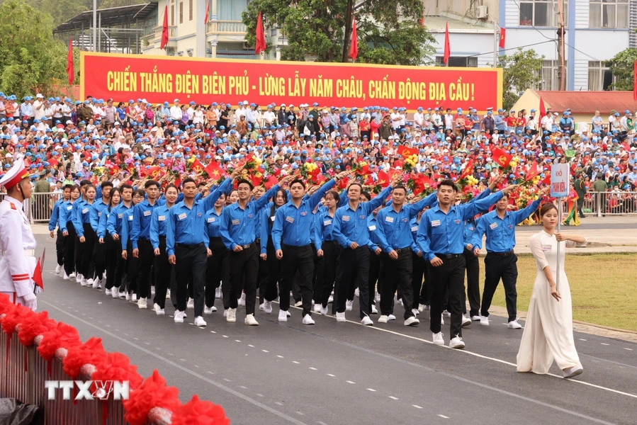 Phần diễu hành của công nhân, nông dân, trí thức, thanh niên, phụ nữ, khối các dân tộc Tây Bắc, khối nghệ thuật tái hiện khí thế hào hùng của Chiến thắng lịch sử Điện Biên Phủ “lừng lẫy năm châu, chấn động địa cầu”; thể hiện khí phách, sức mạnh vô địch của khối đại đoàn kết toàn dân tộc; truyền thống yêu nước, ý chí tự lực, tự cường; hăng hái thi đua lao động sản xuất, đổi mới, sáng tạo.