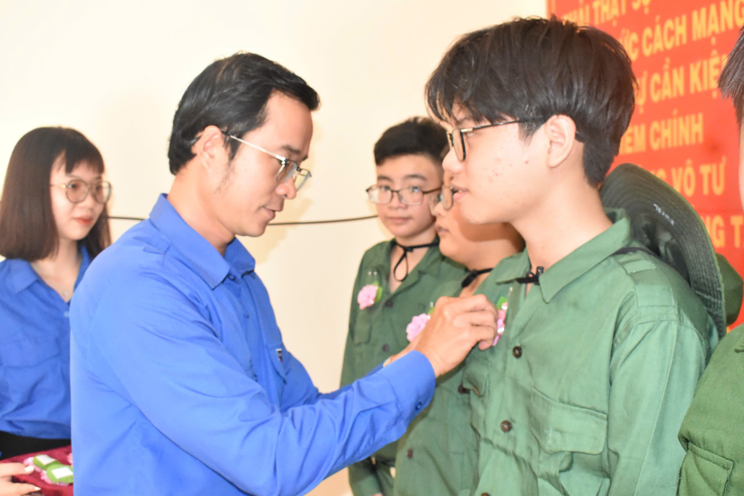 Cài hoa động viên các chiến sĩ nhí